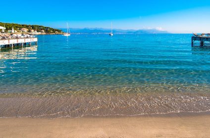 Fine‑sand private beach in Baie de la Garoupe with panoramic restaurant Le César.